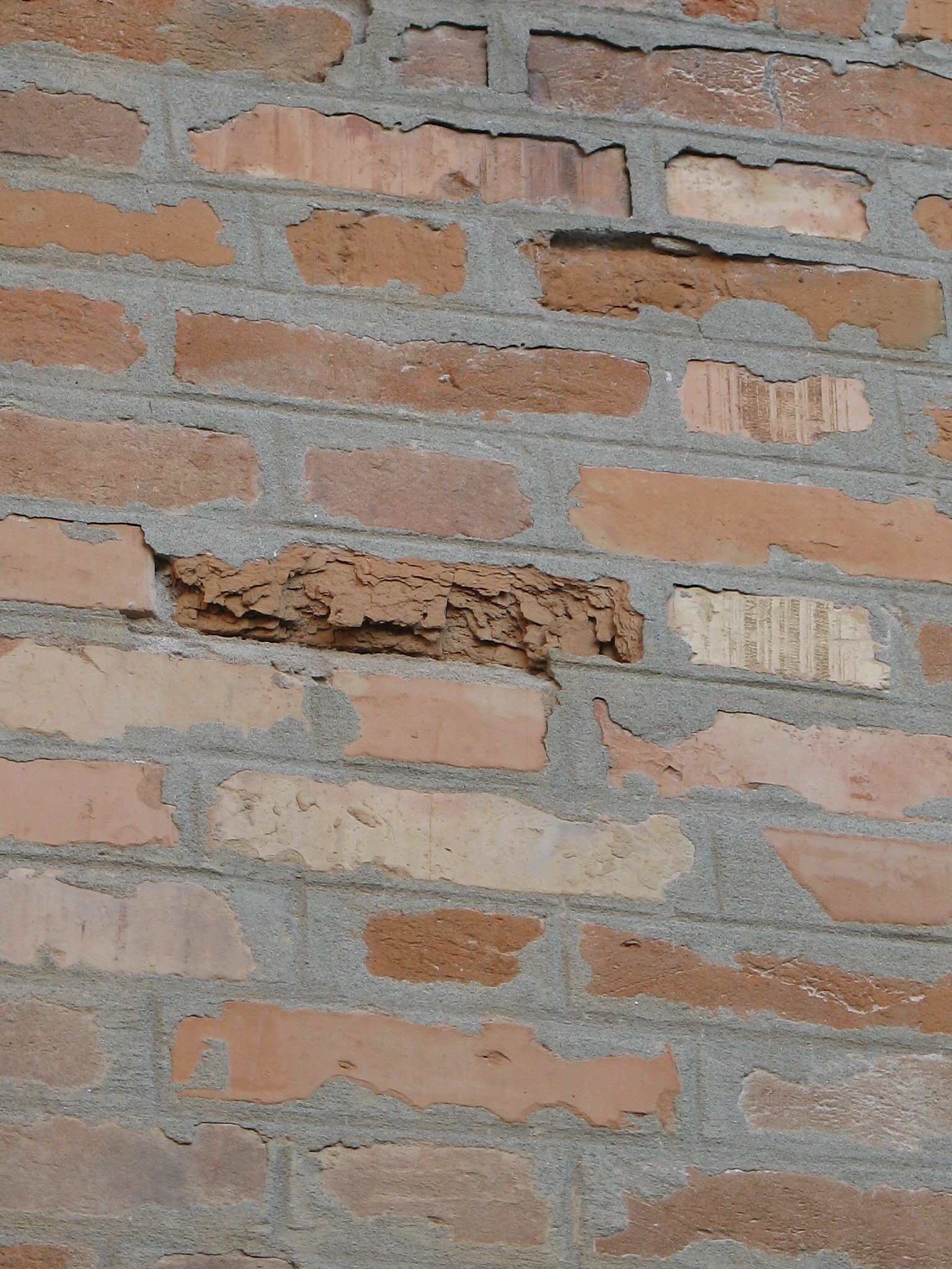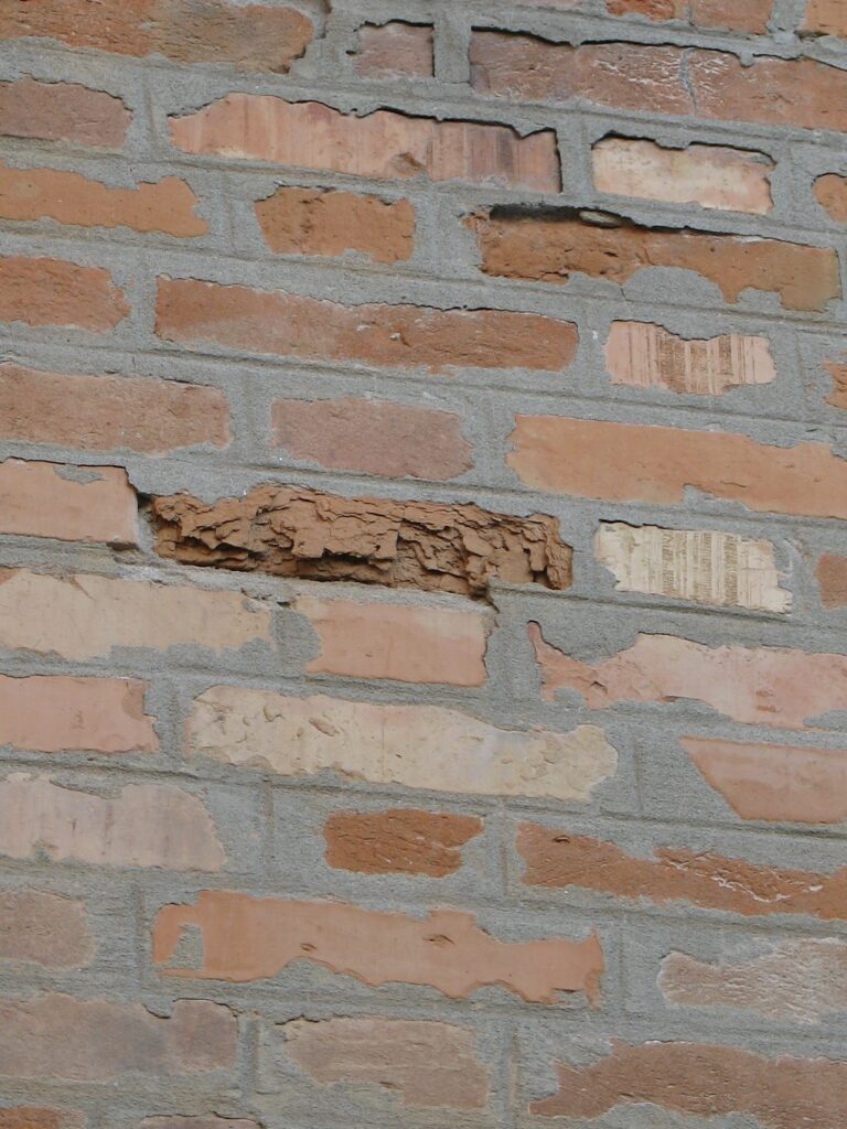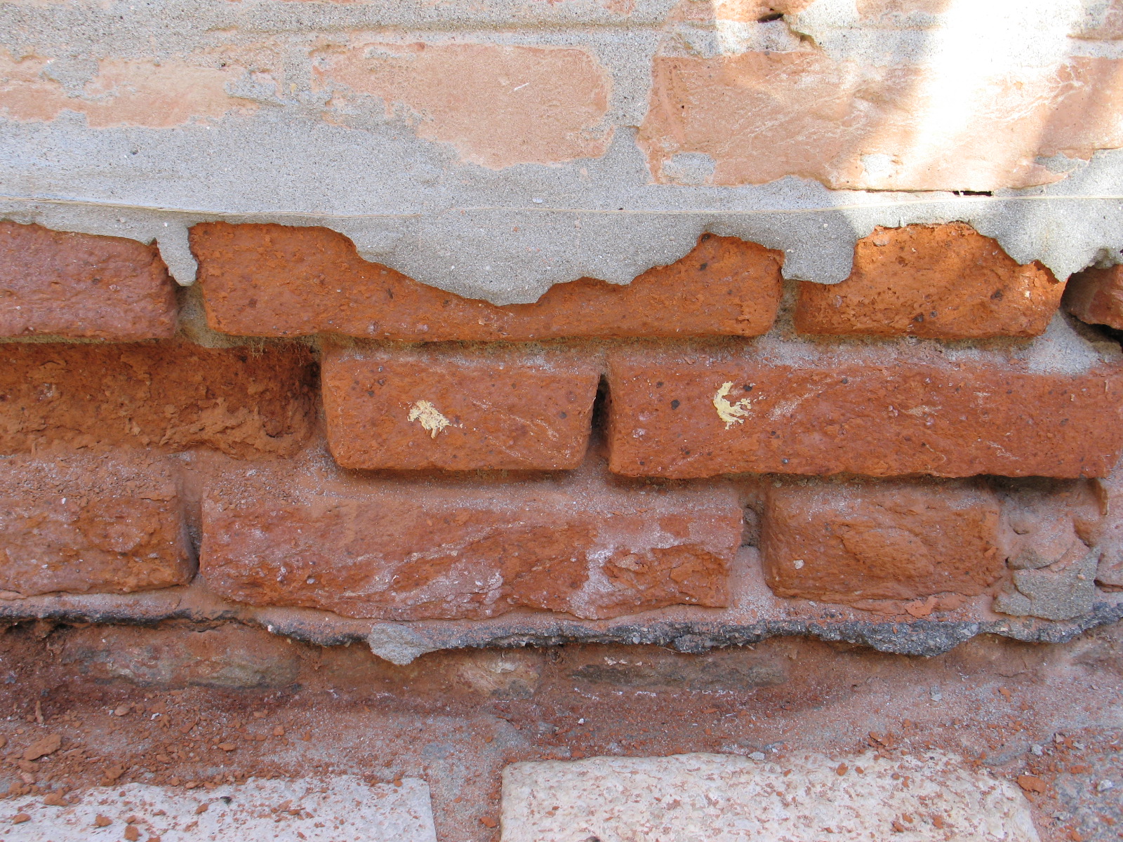 10 settembre 2005 – Base del muro esterno della biblioteca con tagli della parete ( uno al livello del terreno ed uno tre file di mattoni più sopra ).